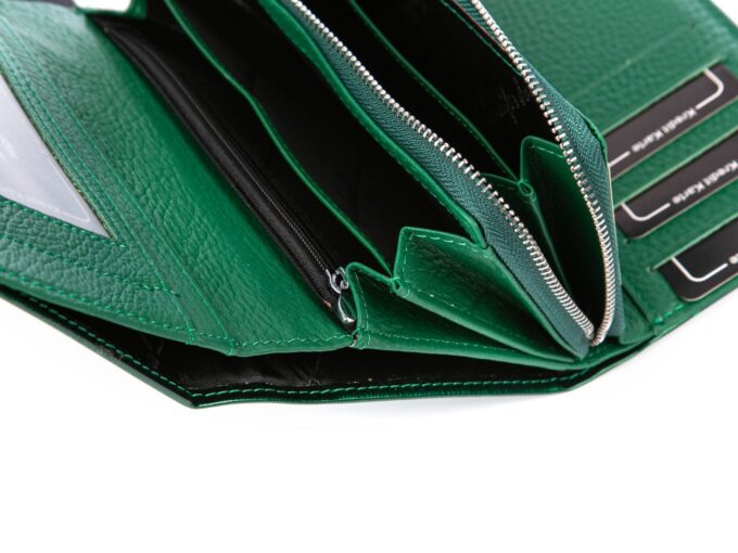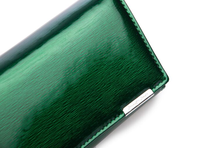 - Duży, zielony (kolor butelkowej zieleni) portfel damski z gładką taflą lakieru i delikatnym wzorkiem w cieniowane, metaliczne linie.