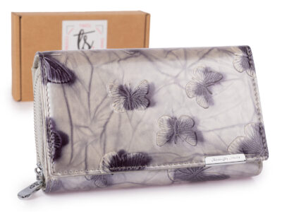 Duży portfel damski lakierowany srebrny z motylkami skóra naturalna Jennifer Jones