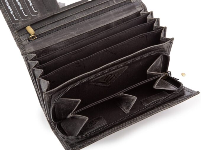 - Pojemny, skórzany, ręcznie szyty, portfel damski w kolorze czarnym, stworzony w modnym stylu vintage.