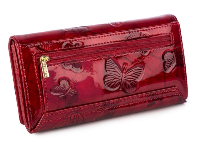 - Duży i poziomy, lakierowany, portfel damski z wzorkiem w wytłoczone motylki w kolorze krwisto-czerwonym.