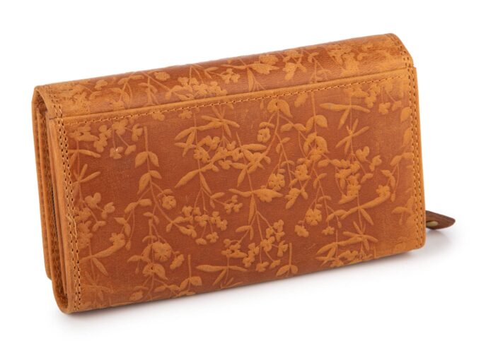 Duży poziomy portfel damski jasnobrązowy szyty ręcznie ze skóry naturalnej w kwiaty RFID