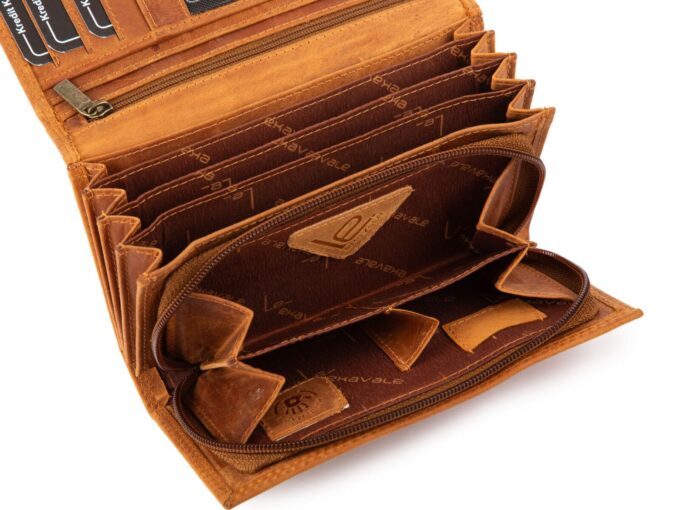 - Pojemny, skórzany, ręcznie szyty, portfel damski w kolorze jasnobrązowym, stworzony w modnym stylu vintage.
