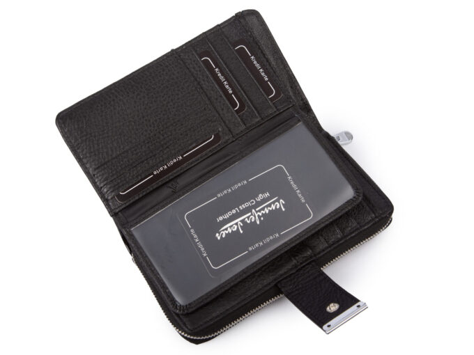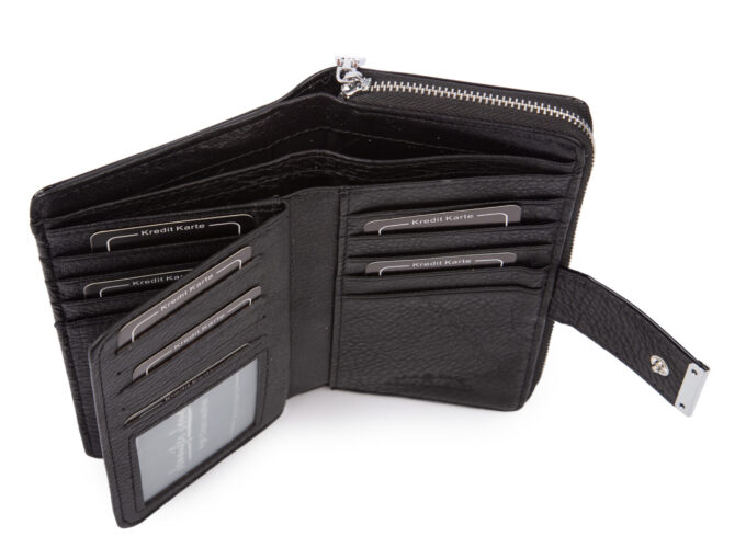 - Portfel posiada miejsce na dużo kart płatniczych i lojalnościowych, dokumenty wielkości dowodu osobistego, banknoty, wizytówki, monety i zdjęcia bliskich osób.
