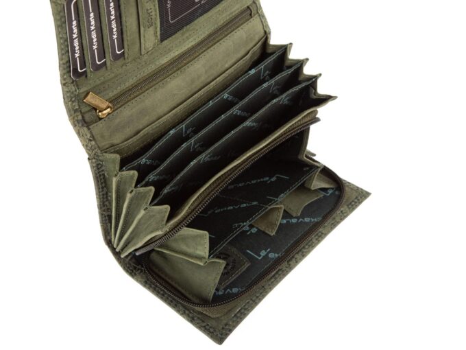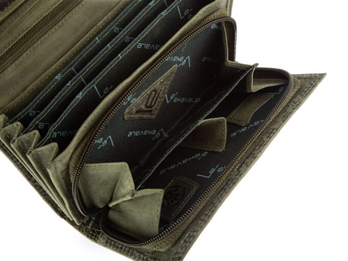 - Pojemny, skórzany, ręcznie szyty, portfel damski w kolorze zielonym, stworzony w modnym stylu vintage.