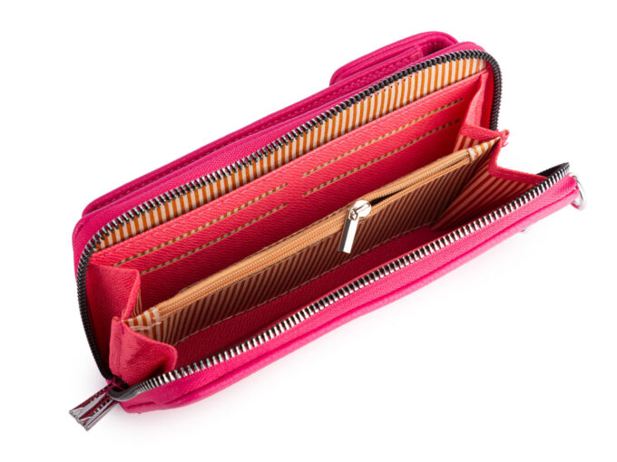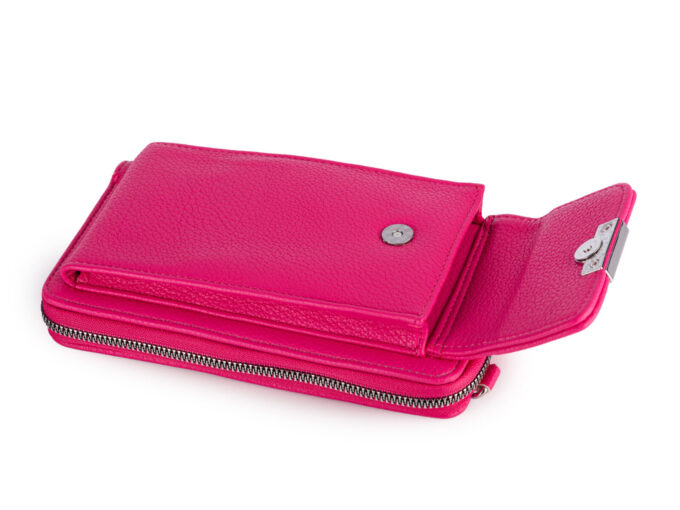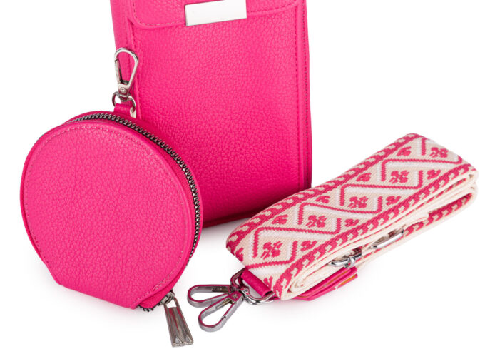 - Duży, różowy, pionowy portfel damski z paskiem na ramię i małą saszetką.