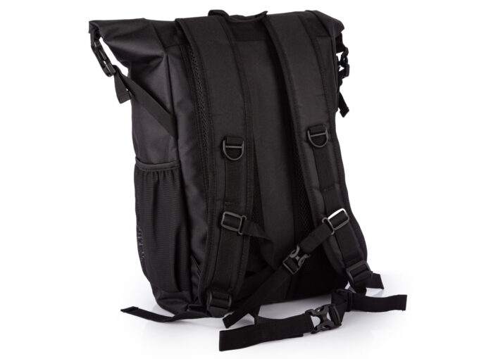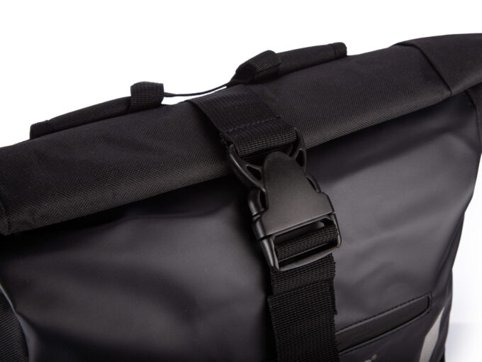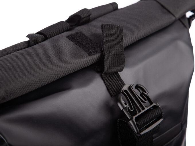 - Na górze plecaka znajduje się zwijany kołnierz zapinany na trzy klamerki, oraz pasek z rzepem.