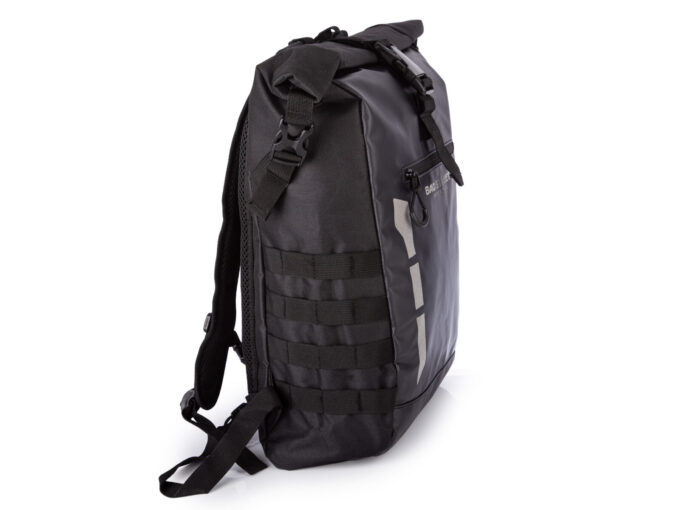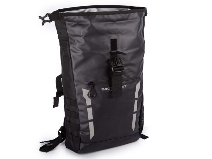 - Duży, wodoodporny plecak trekkingowy / sportowy ze zwijanym kołnierzem.
