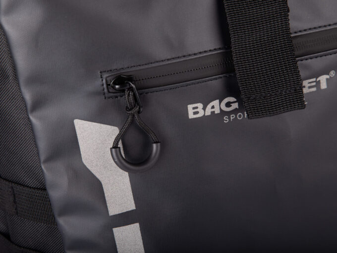 - Z boku plecaka, z jednej strony, znajdują się uchwyty do przyłączenia akcesoriów za pomocą karabińczyka. Z drugiej storny plecak jest wyposażony w kieszeń z siateczki do przenoszenia napoju.