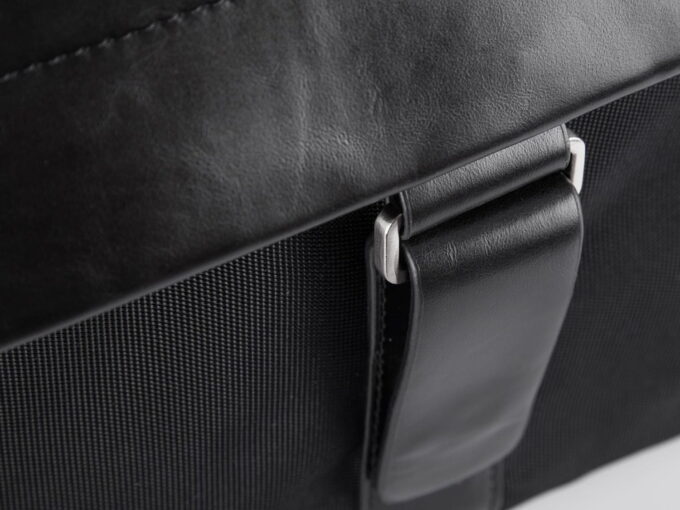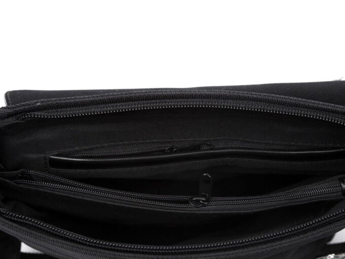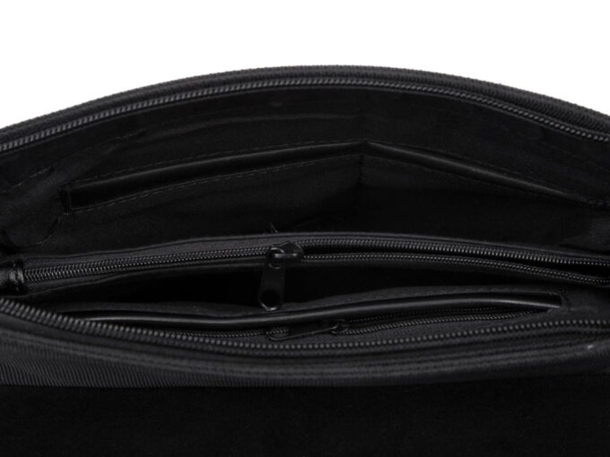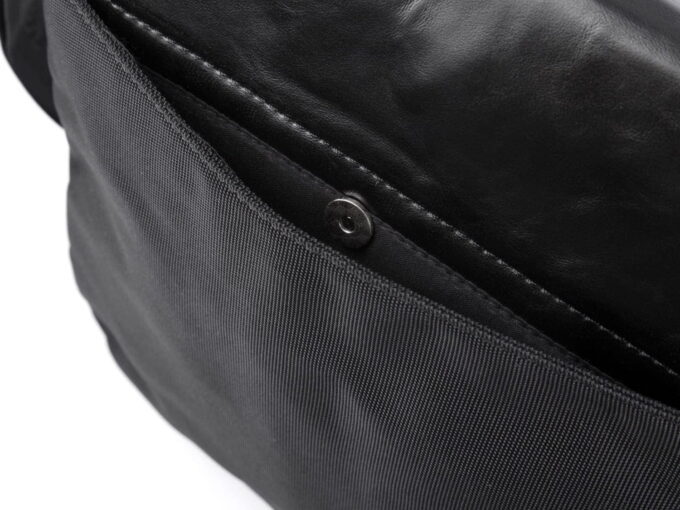 Czarną, solidną klapę która szczególnie wyróżnia ten model, stworzono z wysokiej jakości skóry ekologicznej. Posiada ona elegancką, lekko błyszczącą powierzchnię dzięki czemu świetnie kontrastuje z głęboką czernią materiału z którego wykonana jest reszta torebki.