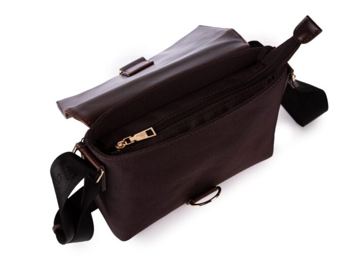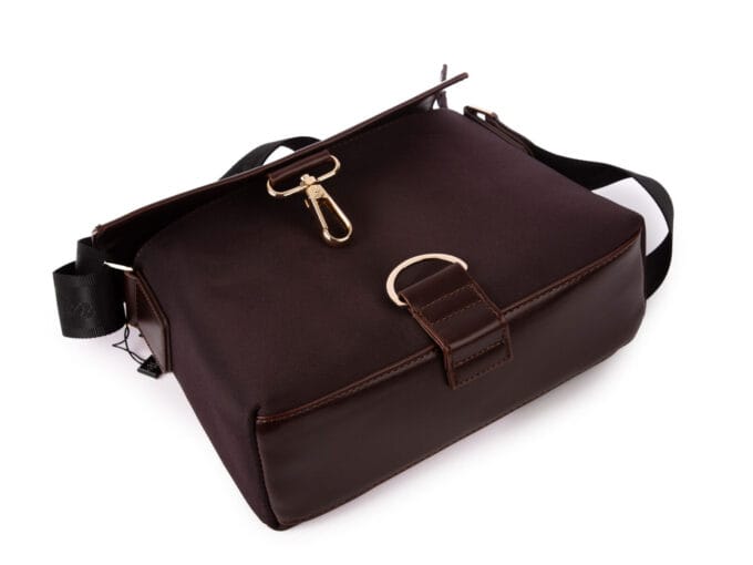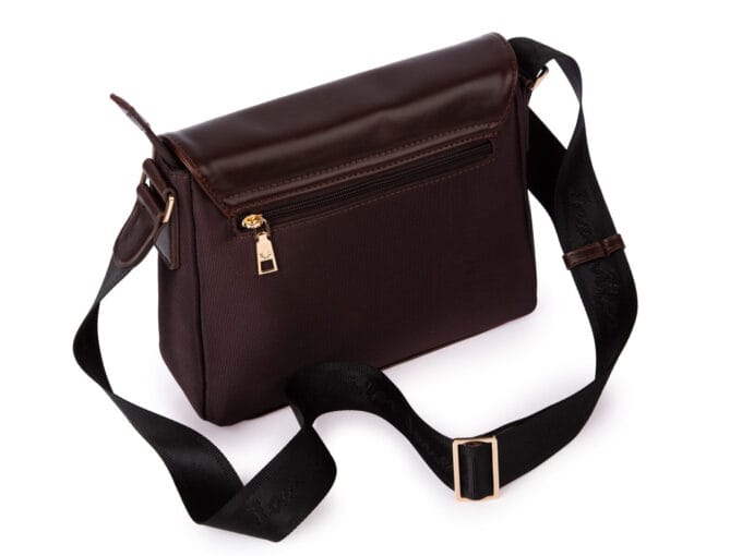 - Brązowa, elegancka torebka damska w kolorze czarnym z klapką zapinaną na karabińczyk.