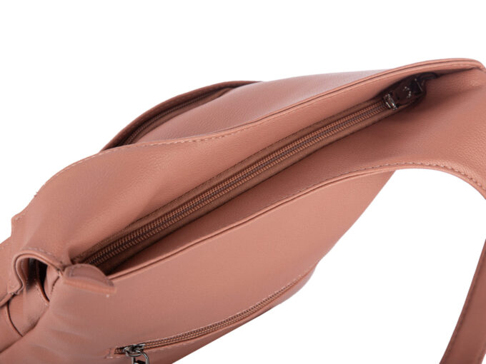 - W górnej części torebki znajduje się oryginalny kołnierz osłaniający dostęp do komory głównej, po bokach podniesiony z mocowaniami paska na ramię.