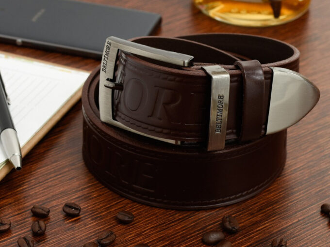 • Elegancki, brązowy, skórzany pasek męski do spodni z metalową klamrą klasyczną.