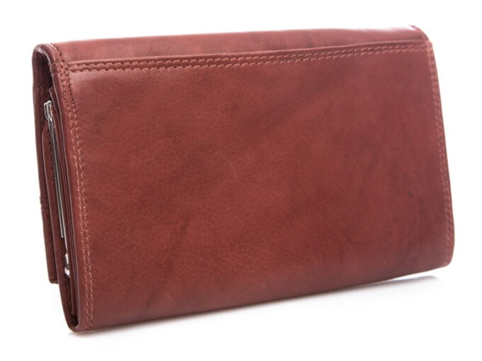 Delikatność miękkiej skóry naturalnej użytej do produkcji tego modelu łączy się z niezwykłą trwałością. Delikatne zabarwienie w kolorze kasztanowym pięknie skomponuje się z rudymi, bądź kasztanowymi włosami albo dobranym pod kolor dodatku ubiorem. Przód portfela zdobi elegancki tłoczony grawerunek z logiem marki.