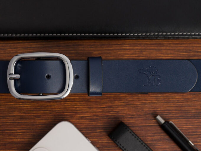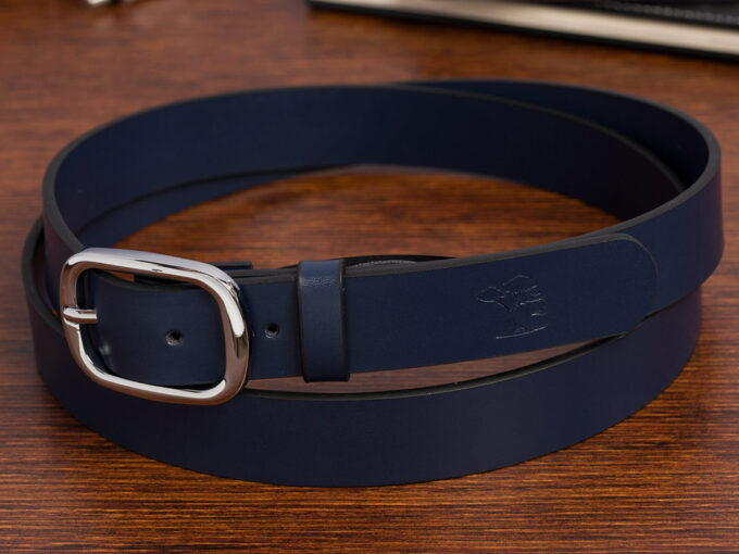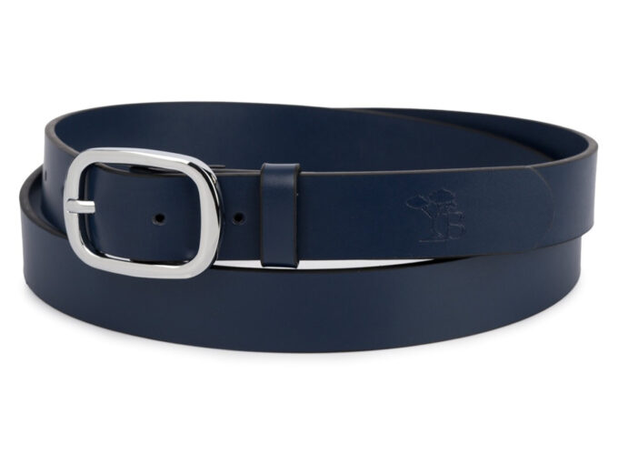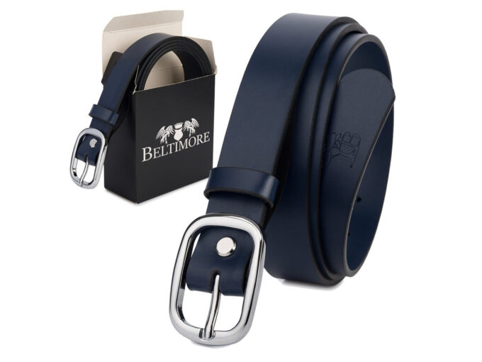- Elegancki, granatowy pasek damski do spodni polskiej marki Beltimore.