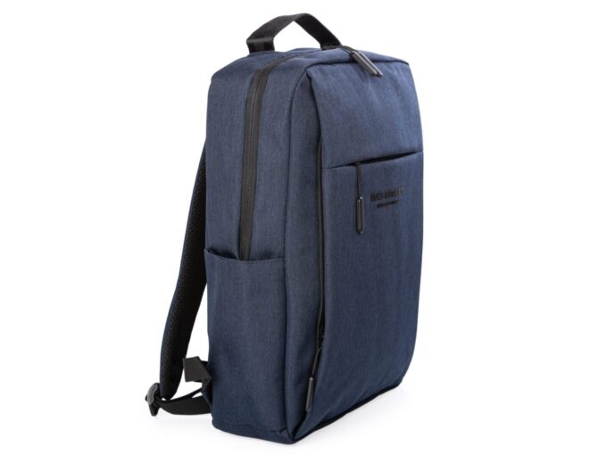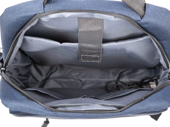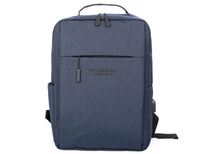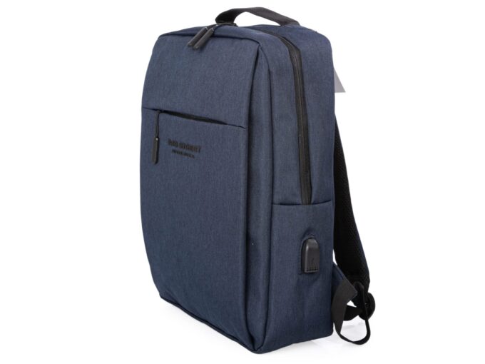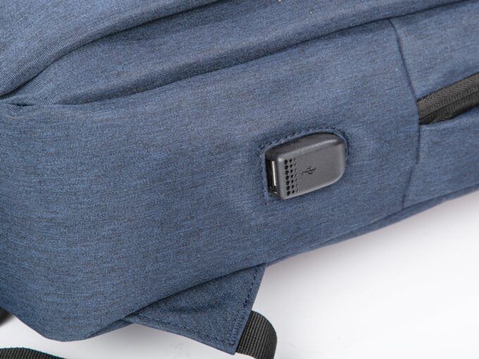 - Elegancki, granatowy plecak do pracy z miejscem na laptopa i portem USB z boku.