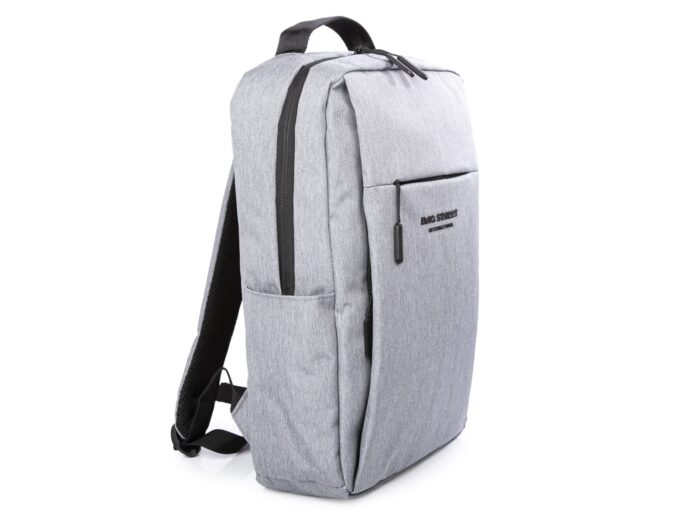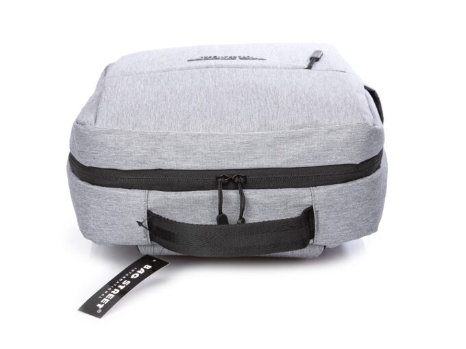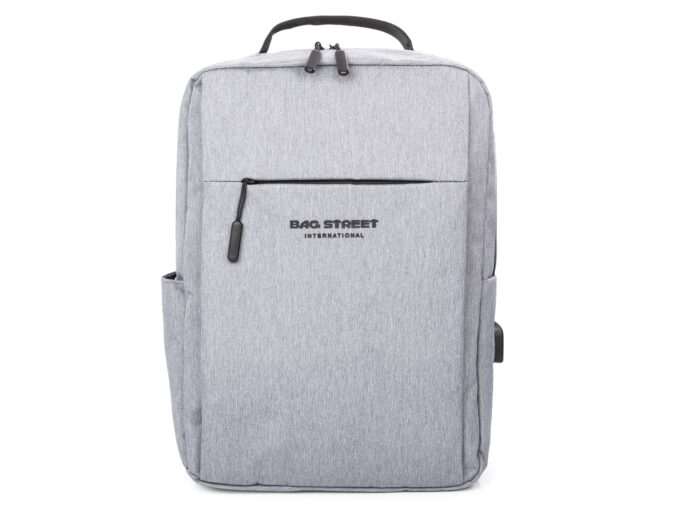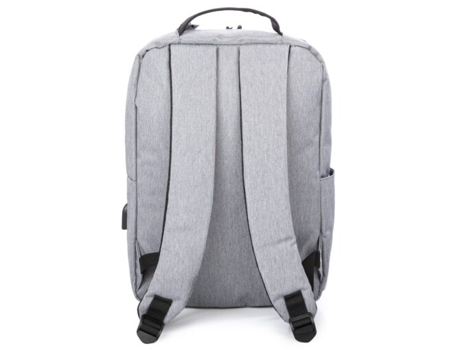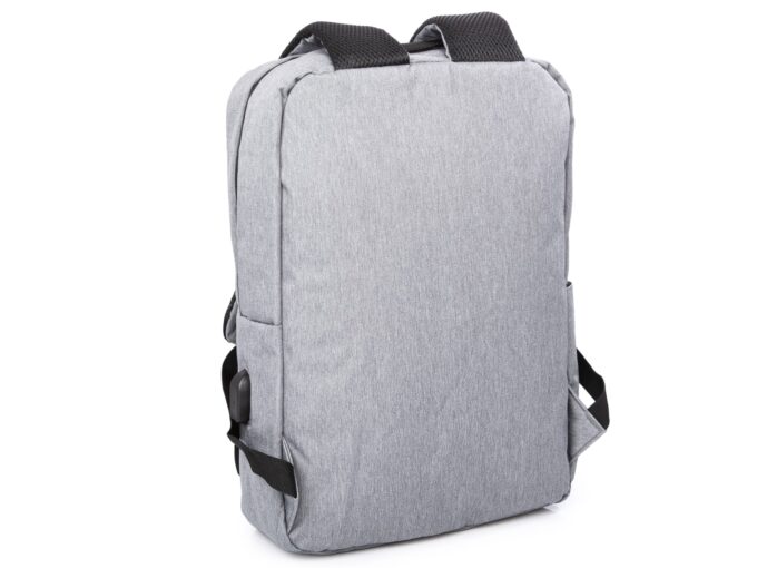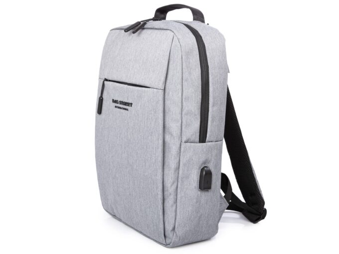 - Elegancki, szary plecak do pracy z miejscem na laptopa i portem USB z boku.