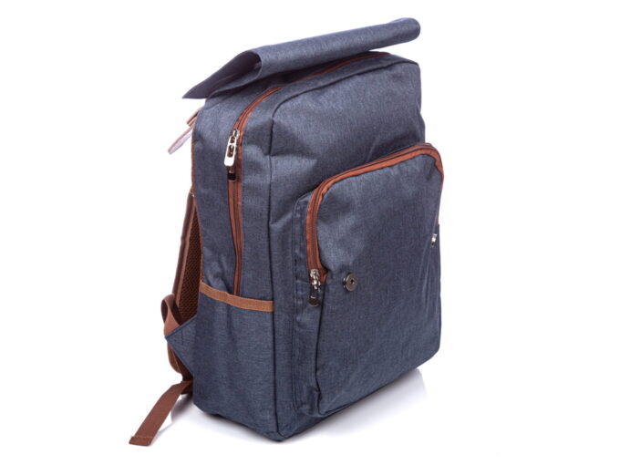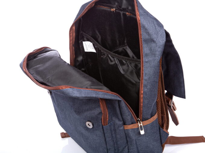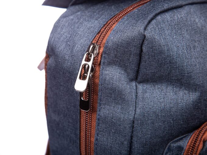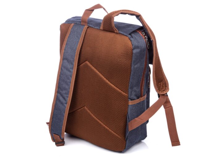 - Elegancki plecak w kolorze granatowym z brązowymi wstawkami.