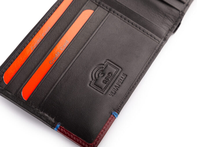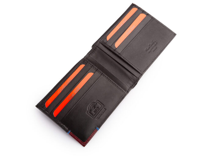 - Elegancki, skórzany, cienki portfel męski w kolorze czarnym z czerwonym akcentem w narożniku.