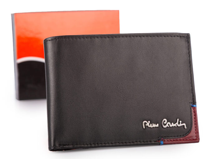 Elegancki, skórzany, cienki portfel męski w kolorze czarnym z czerwonym narożnikiem Pierre Cardin