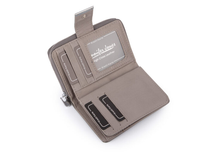 Elegancki, szary portfel damski marki Jennifer Jones, wykonany z wysokiej jakości skóry naturalnej lakierowanej. Bardzo często wybierany model, nasi klienci głównie pokochali w nim to, że spełnia wszystkie stawiane przed portfelem damskim wymagania, przy jednoczesnym zachowaniu kompaktowego rozmiaru. Wyposażony jest w bardzo wygodną kieszeń na monety, zapinaną na metalowy zamek. Ponadto, pomieści bez trudu najpotrzebniejsze karty, dokumenty, zdjęcia bliskich i banknoty, czyli wszystko co potrzebne na co dzień.