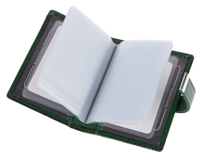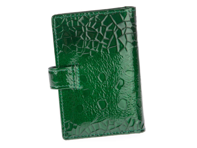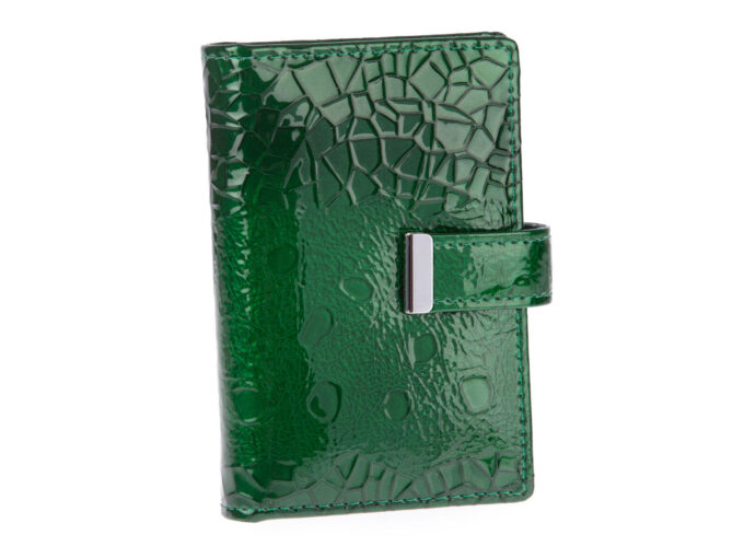 - Zielony wizytownik (Etui na dokumenty i karty) wykonany z lakierowanej skóry naturalnej z oryginalnym, marmurkowym wzorem,