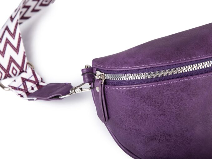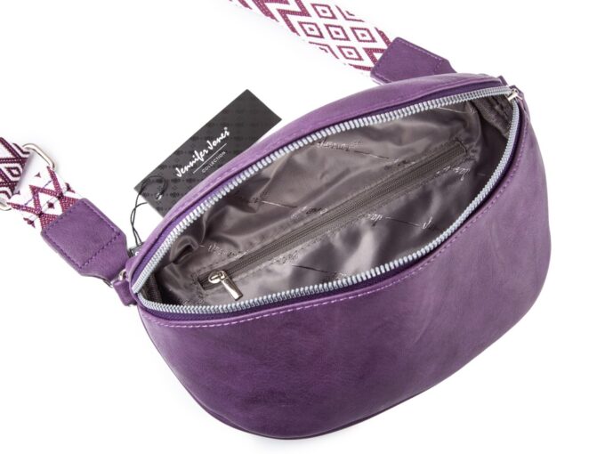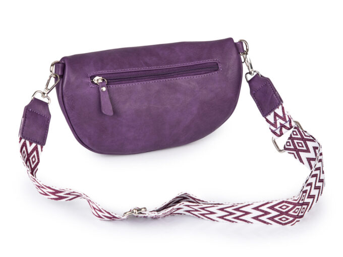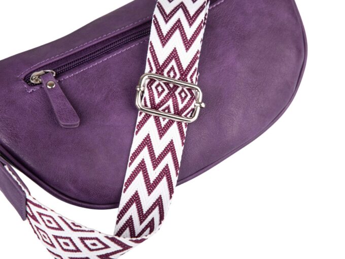 - Fioletowa saszetka damska nerka z paskiem na ramię.