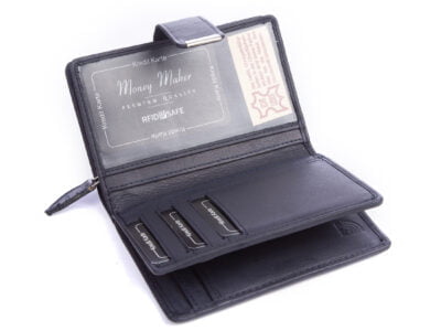 • Gładki granatowy skórzany portfel damski Money Maker RFID