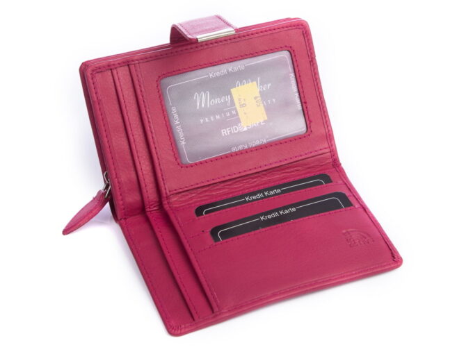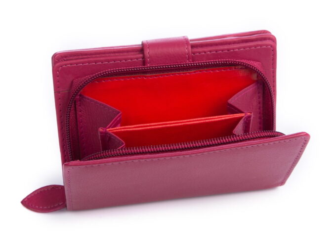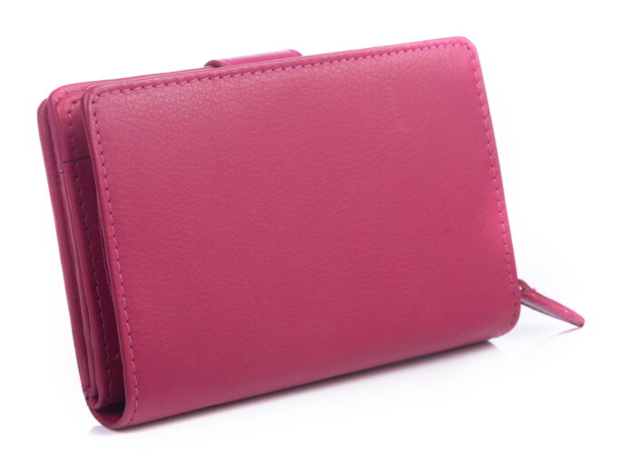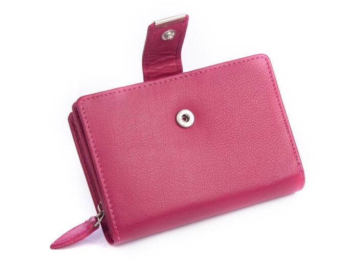 Wykonany z gładkiej, miękkiej skóry naturalnej portfel damski w kolorze różowym. Portfel zapinany jest na pasek z zatrzaskiem, posiada pojemną kieszeń na monety zapinaną na zamek błyskawiczny i ochronę kart zbliżeniowych RFID.