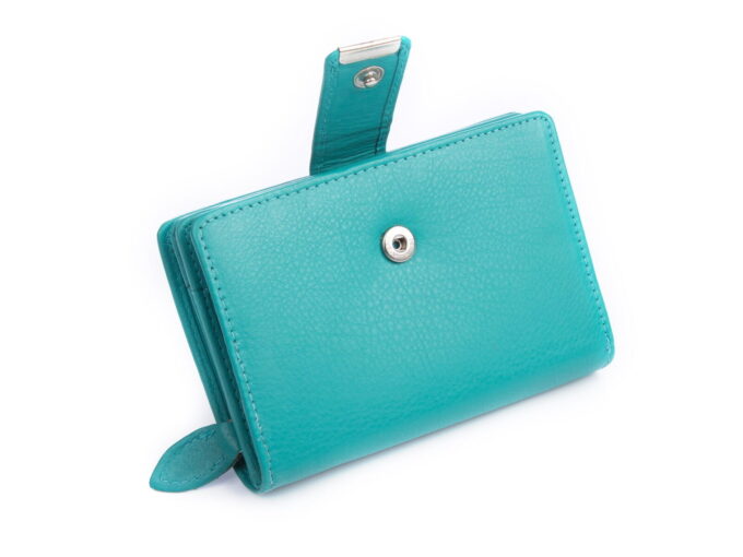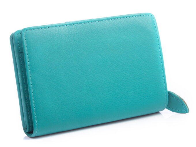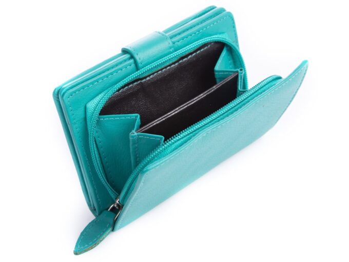 Wykonany z gładkiej, miękkiej skóry naturalnej portfel damski w kolorze turkusowym. Portfel zapinany jest na pasek z zatrzaskiem, posiada pojemną kieszeń na monety zapinaną na zamek błyskawiczny i ochronę kart zbliżeniowych RFID.