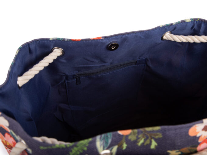 - Granatowa torba damska – shopperka z kolorowym, wzorem w kwiaty.