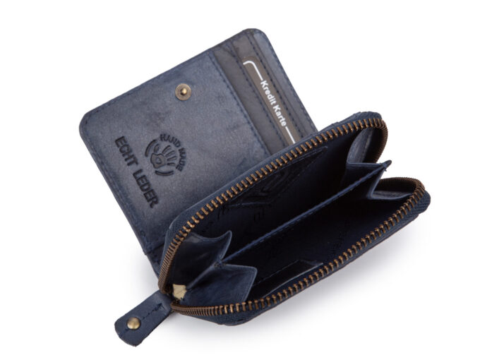 • Kieszeń na monety dzielona jest na dwie części i zapinana dookoła na metalowy zamek błyskawiczny.