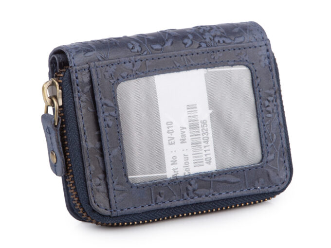 Granatowy mały portfel damski skórzany z kwiatowym wzorem szyty ręcznie RFID