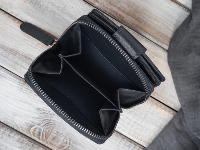 - Pojemna kieszeń na monety, dzielona na dwie cześci i zapinana dookoła na metalowy zamek błyskawiczny.