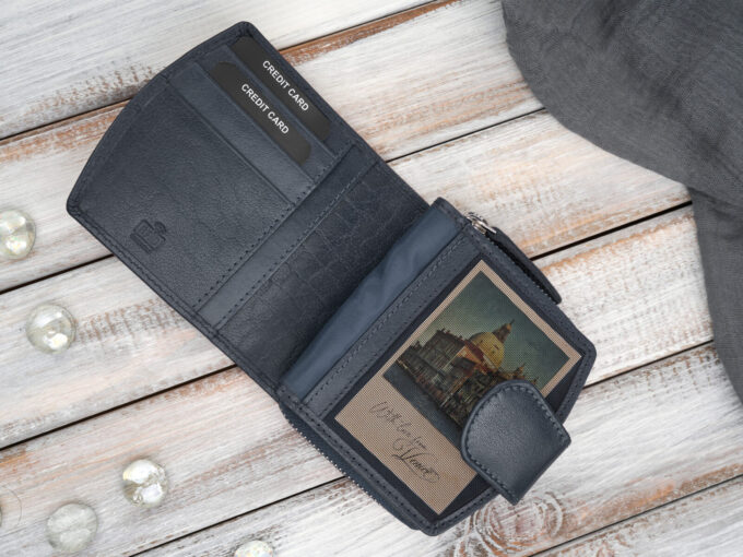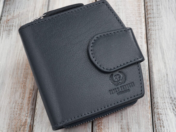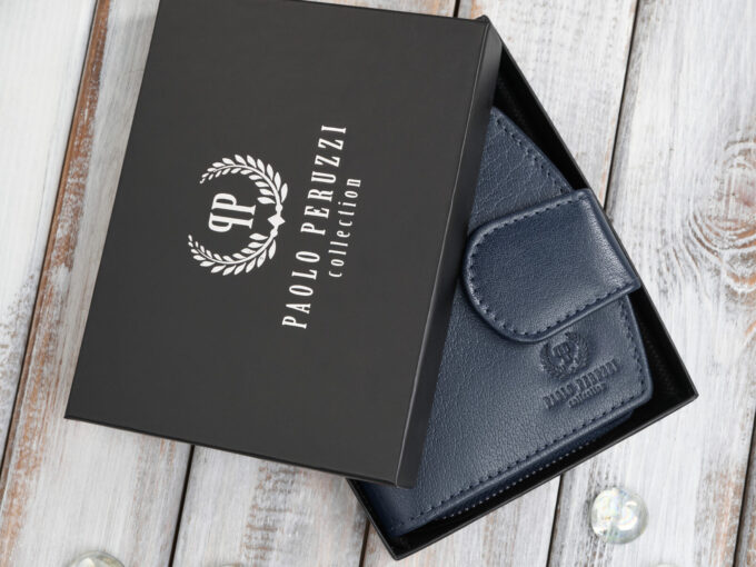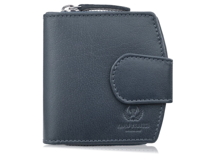 Granatowy, średniej wielkości portfel damski Paolo Peruzzi z gładkiej skóry naturalnej, zapinany na pasek z metalowym zatrzaskiem i zamykany suwakiem, z 5 nieprzezroczystymi kieszonkami na karty, przezroczystą kieszonką na dokumenty, dwoma pionowymi schowkami, dwiema przegrodami na banknoty, pojemną dwuczęściową kieszenią na monety zamykaną metalowym zamkiem błyskawicznym oraz ochroną RFID, sprzedawany w eleganckim firmowym pudełku — idealny jako praktyczny i stylowy prezent. Pełna specyfikacja ⬇