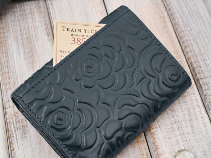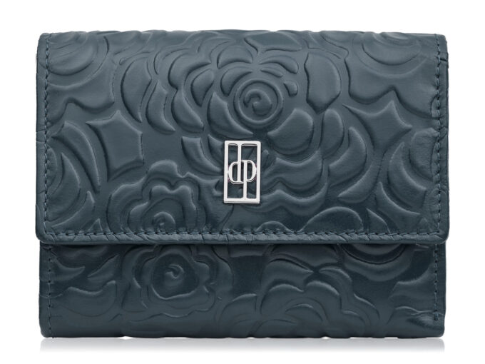 - Granatowy, średni portfel damski skórzany z wzorem w tłoczone kwiaty.