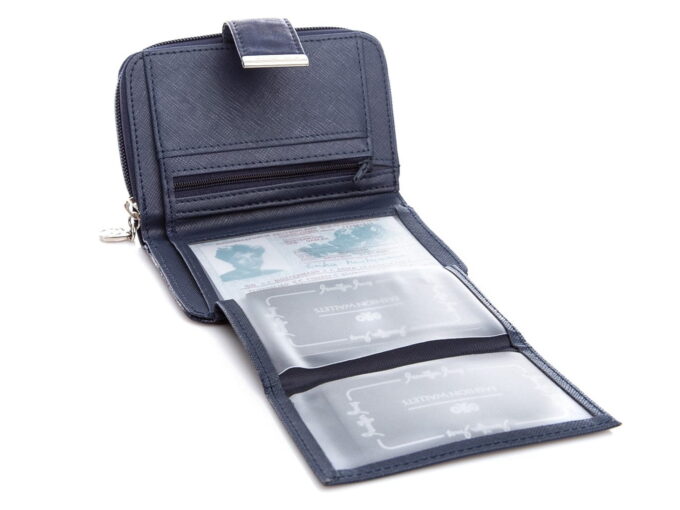 - Przednia część portfela zapinana jest za pomocą paseczka z metalowym zatrzaskiem.