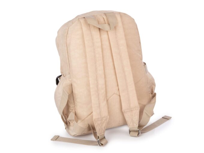 - Lekki, materiałowy plecak w kolorze jasnobeżowym.
