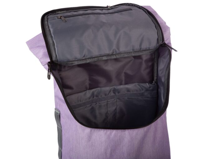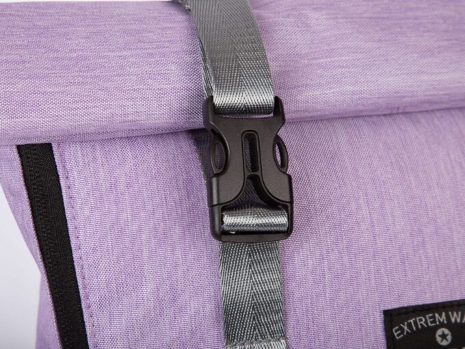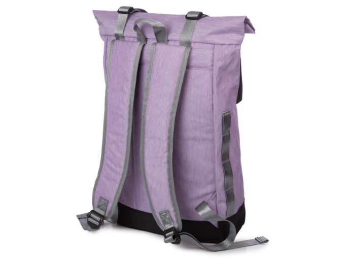 - Jasnofioletowy (liliowy) plecak na wycieczkę ze zwijanym kołnierzem.