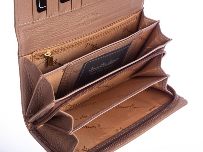 - Jasno-beżowy portfel damski niemieckiej marki Jennifer Jones.