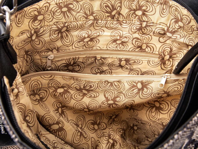 Elegancka torebka damska niemieckiej marki Jennifer Jones. Torba posiada oryginalny beżowy wężowy wzór. Model wykonany jest z bardzo przyjemnego w dotyku, mięciutkiego, błyszczącego materiału.