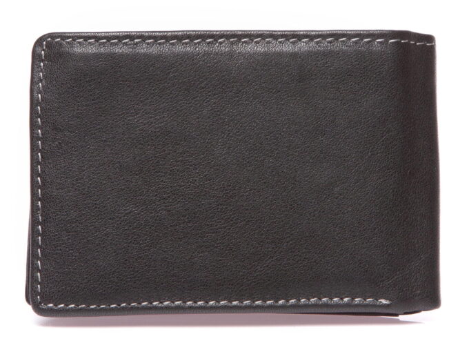 Mały portfel męski skórzany do kieszeni spodni czarny z szarym RFID