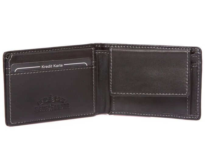 - Portfel posiada także przegrodę na banknoty, oraz kieszeń na monety zapinaną na patkę z metalowym zatrzaskiem.