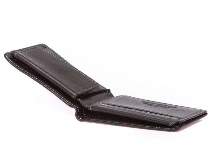- Portfel posiada dwie kieszonki przezroczyste (tzw. okienka) do których zmieszczą się karty, zdjęcia i dokumenty wielkości dowodu osobistego lub prawa jazdy.