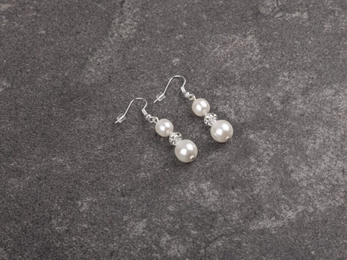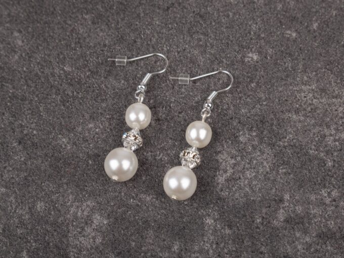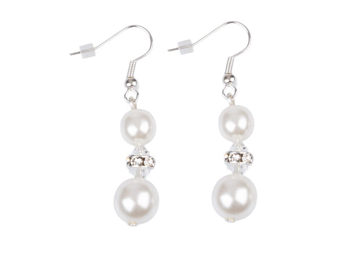 - Eleganckie kolczyki damskie z białymi perłami, wiszące.