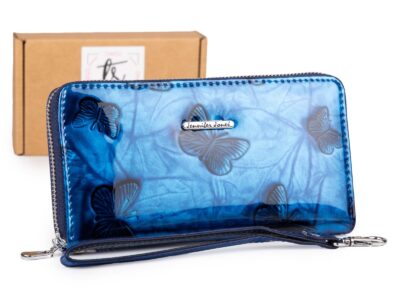 Duży niebieski portfel damski lakierowany w motylki zapinany dookoła na suwak z paskiem na rękę