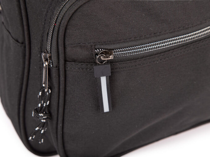- Z przodu znajdują się dwie podręczne kieszenie zapinane na zamki błyskawiczne, jedna duża, druga mniejsza.