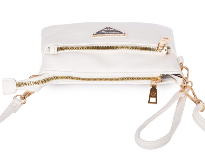 - Mała bankietowa torebka damska na ramię w kolorze białym ze złotymi okuciami.