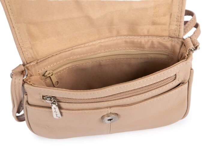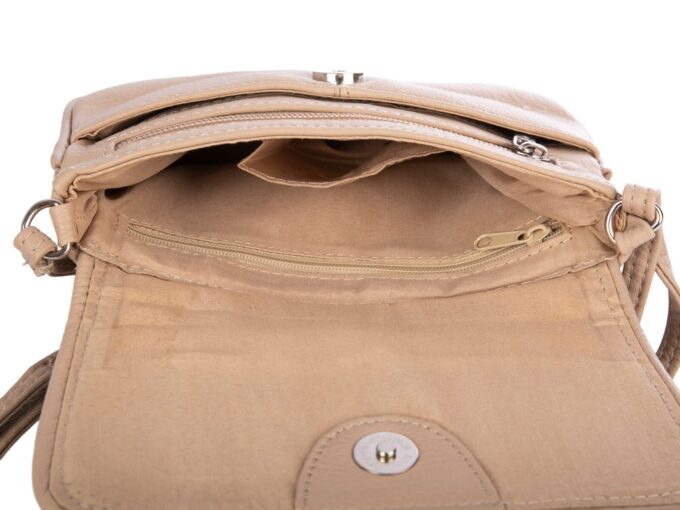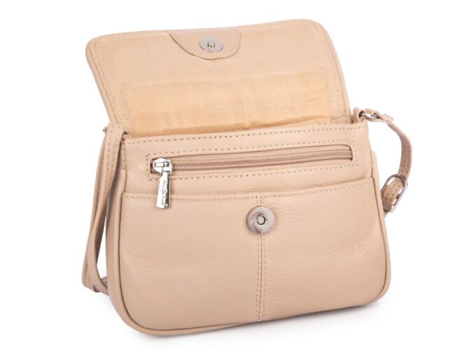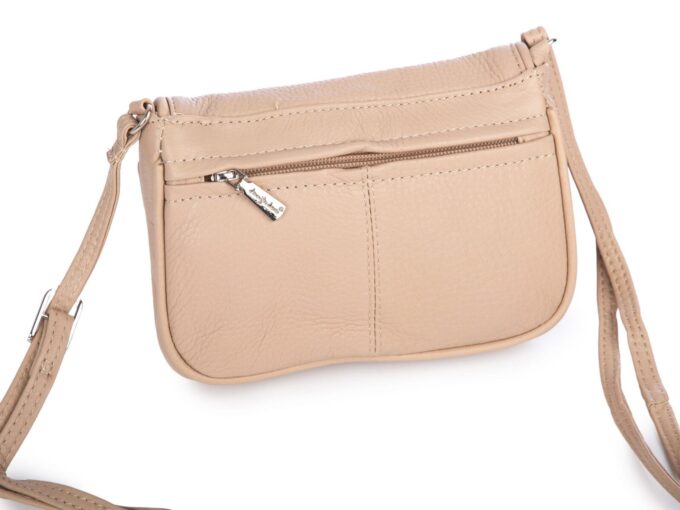 - Mała beżowa torebka damska uszyta ze skóry naturalnej.