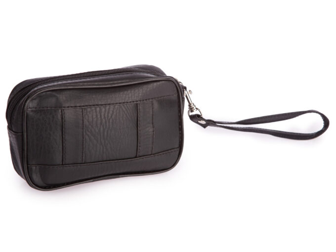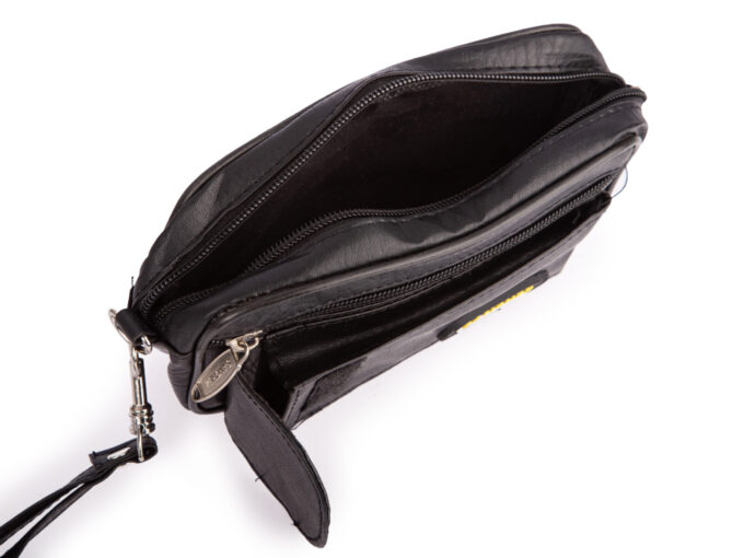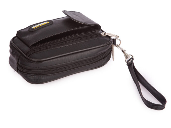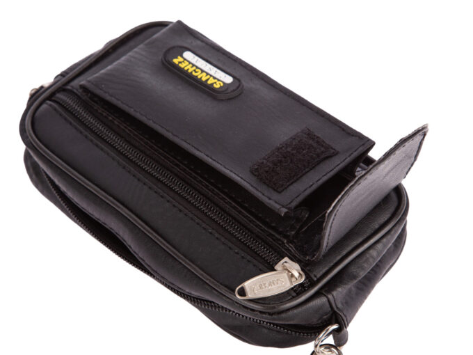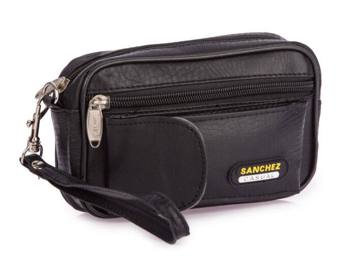 - Czarna saszetka męska z odpinanym paskiem do ręki, oraz mocowaniem do paska od spodni.