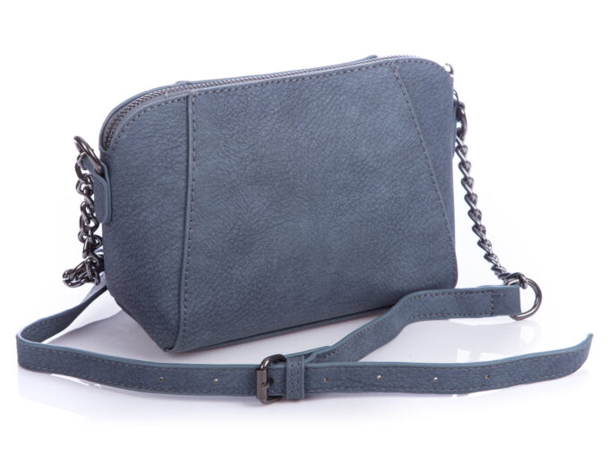 Mała niebieska torebka wieczorowa Jennifer Jones wykonana z wysokiej jakości skóry ekologicznej. Wykończona chromowanymi łańcuszkami będącymi uchwytami paska na ramię.